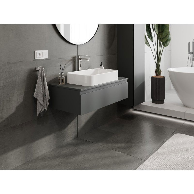 Špecifikácia produktu: Rozmery skrinky: Šírka: 90 cm Výška: 23,5 cm Hĺbka: 46 cm Farba korpusu: Matný grafit Materiál korpusu: Lakovaná doska Farba čela: Matný grafit Materiál čela: Lakovaná MDF doska Štruktúra čela: Hladká Počet zásuviek: výsuv pre ľahký prístup k obsahu zásuvky Povrch odolný voči UV žiareniu Rozmery pracovnej dosky: Šírka: 90,6 cm Hĺbka: 46,5 cm Hrúbka: 1,8 cm Farba pracovnej dosky: Matný grafit Materiál pracovnej dosky: Lakovaná MDF doska Povrch odolný voči UV žiareniu Ideálny ako podstavec
