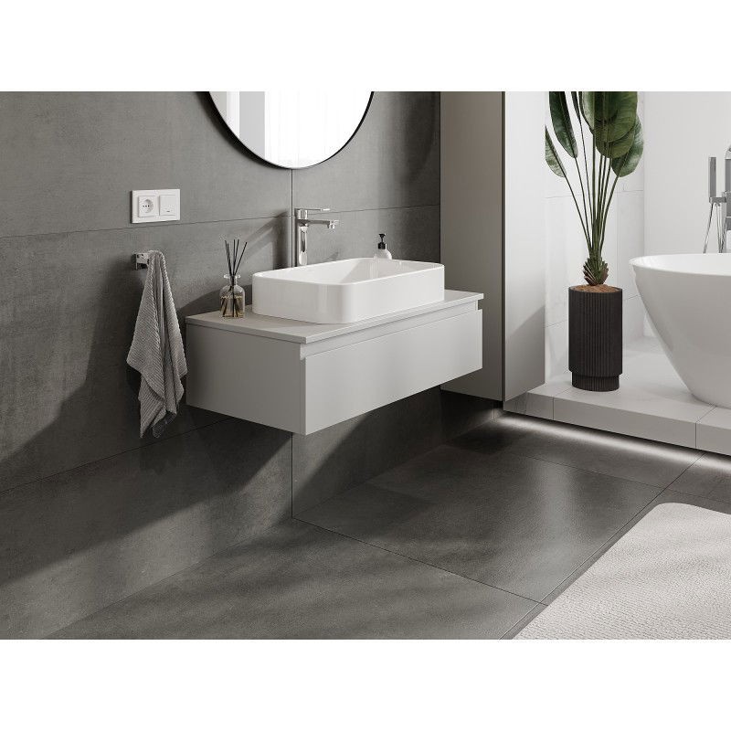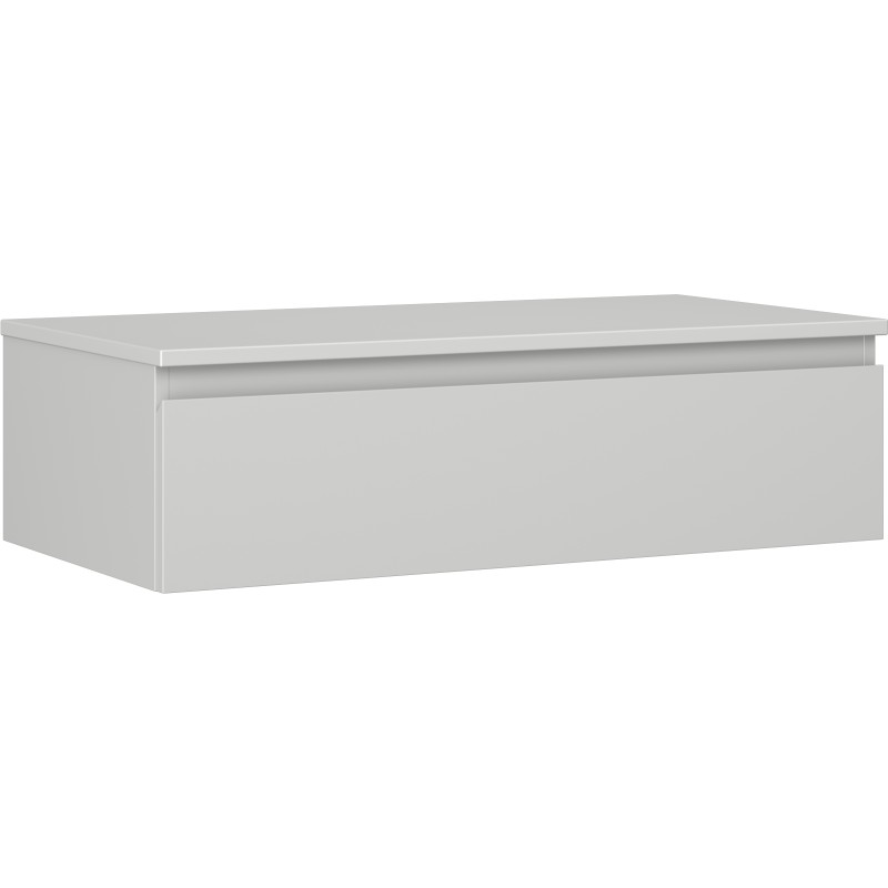 Špecifikácia produktu: Rozmery skrinky: Šírka: 90 cm Výška: 23,5 cm Hĺbka: 46 cm Farba korpusu: Matne šedá Materiál korpusu: Lakovaná doska Farba čela: Matne šedá Materiál čela: Lakovaná MDF doska Štruktúra čela: Hladká Počet zásuviek: 1 výsuv pre ľahký prístup k obsahu zásuvky Povrch odolný voči UV žiareniu Rozmery pracovnej dosky: Šírka: 90,6 cm Hĺbka: 46,5 cm Hrúbka: 1,8 cm Farba pracovnej dosky: Matne šedá Materiál pracovnej dosky: Lakovaná MDF doska Povrch odolný voči UV žiareniu Ideálny ako podstavec