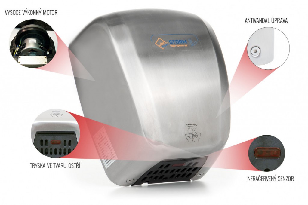 STORM predstavuje kombináciu kompaktných rozmerov teplovzdušných osúšače sa sušiace silou tryskových vysúšačov. Robustná kovová konštrukcia je vhodná aj do vysoko frekventovaných miest.