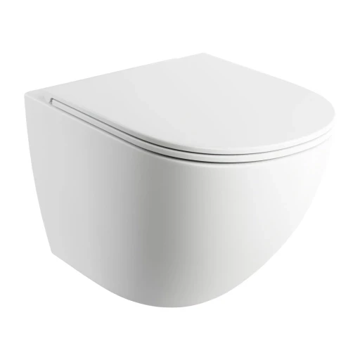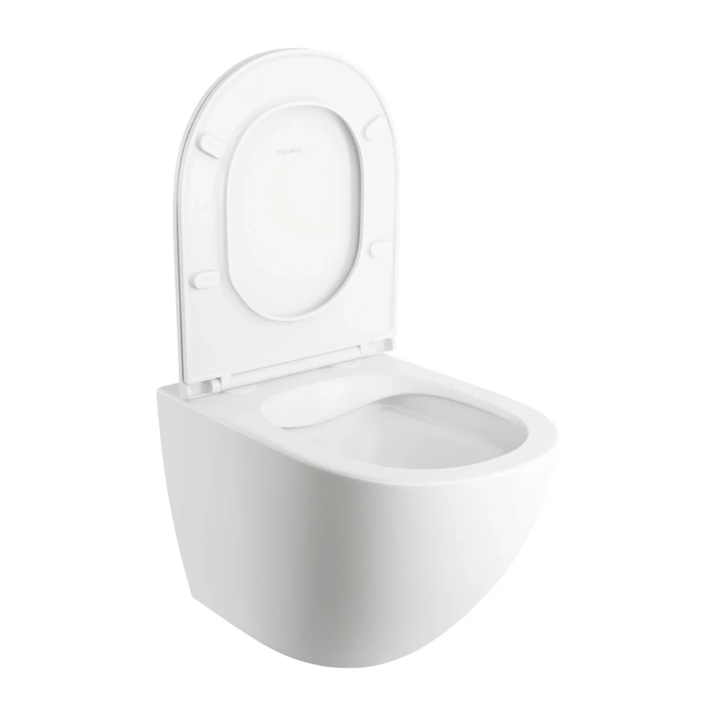 Závesná keramická WC misa OMNIRES OTTAWA bez oplachového kruhu RIMLESS so skrytým uchytením vrátane duroplastového sedátka SLIM s komfortnou technológiou pomalého sklápania a easy-off /ľahká demontáž uľahčuje dôkladnú údržbu/.