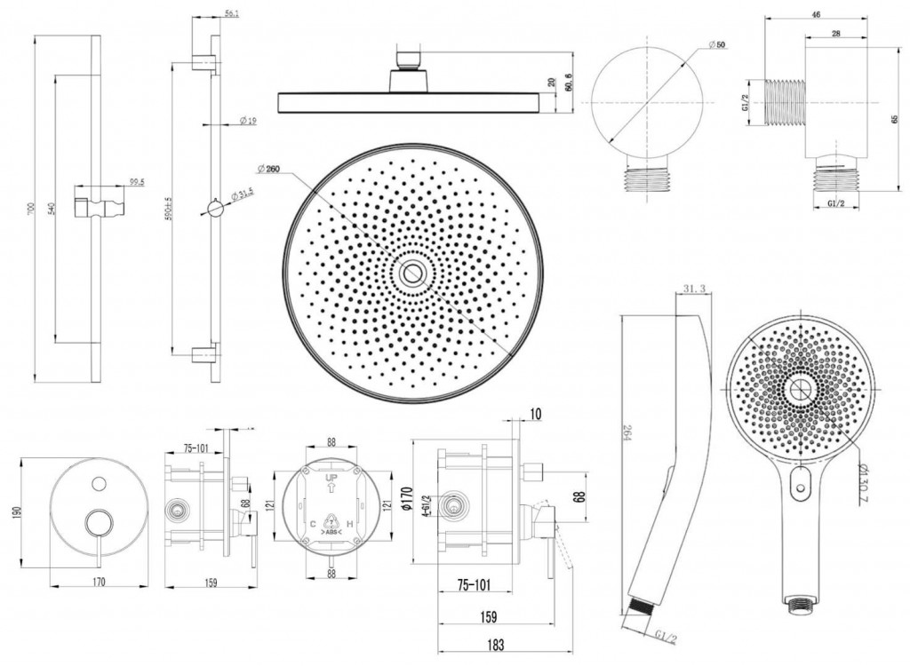 hornú sprchu 260 mm so sprchovým ramenom 350 mm