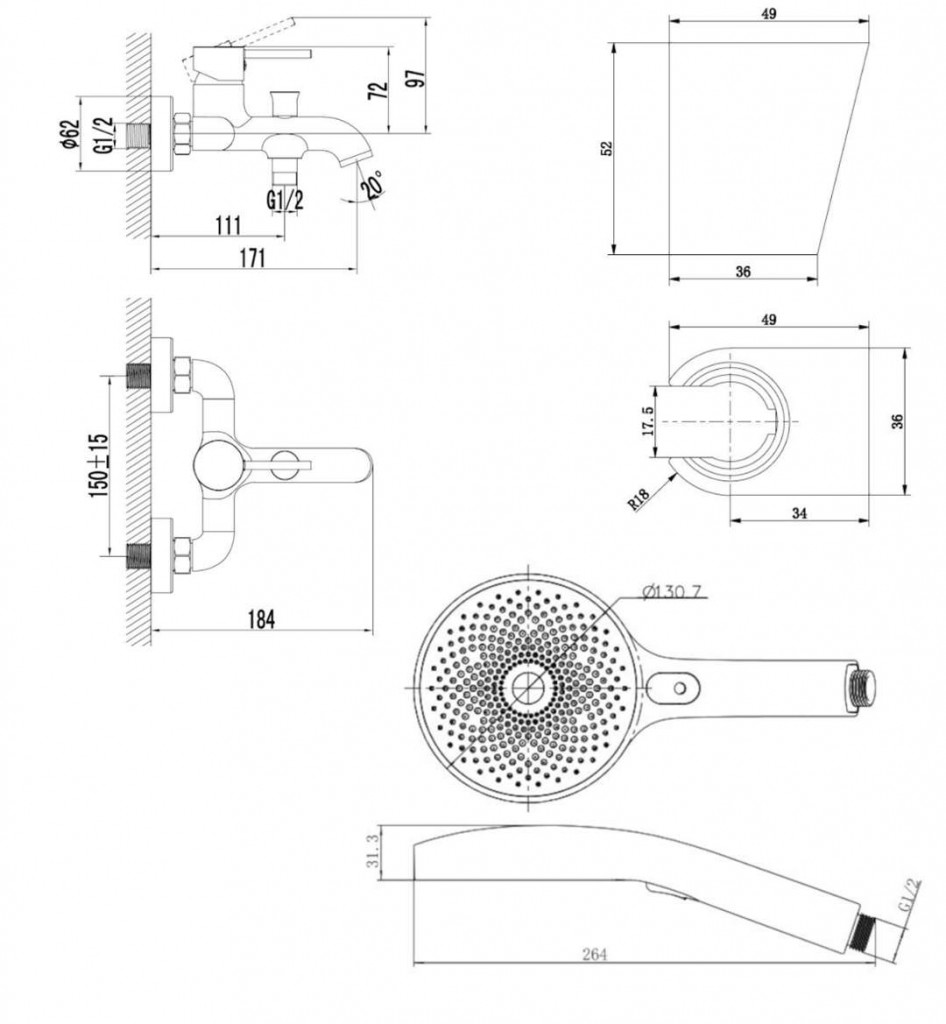 ručnú sprchu 130 mm, 3 prúdy