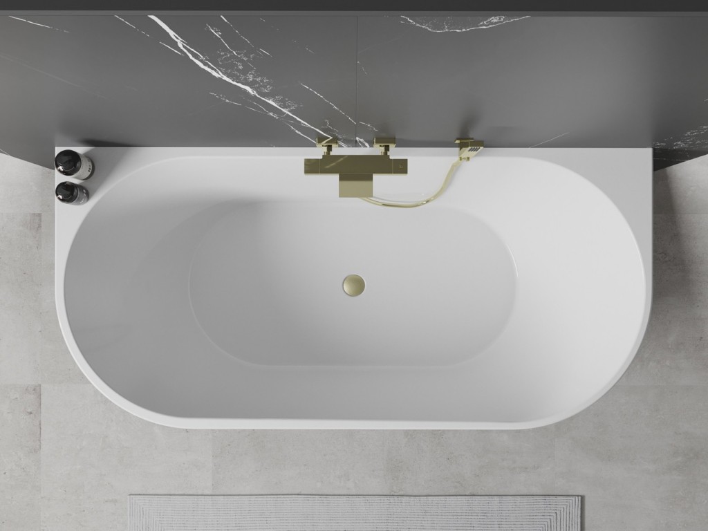 Voľne stojaca oválna akrylátová vaňa s inštaláciou k stene séria OVAL od výrobcu MEXEN s prepadom a umiestnenom odpade na strede vane.