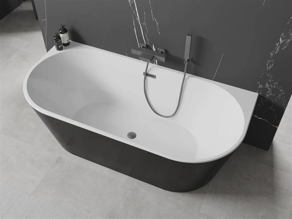 Voľne stojaca oválna akrylátová vaňa s inštaláciou k stene série OVAL od výrobcu MEXEN s prepadom a umiestnenom odpade na stred vane.