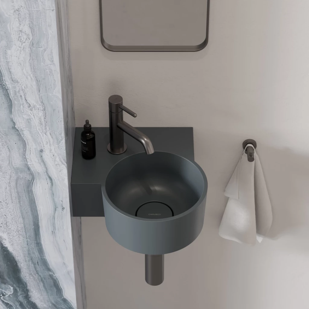 Umývadlo z kolekcie OMNIRES OVO sa vyznačuje minimalistickým, expresívnym tvarom s dokonalými proporciami. Hravá geometria vytvára okrúhlu misu v kombinácii s funkčnou obdĺžnikovou poličkou – ideálne miesto na montáž batérií, ale aj na uloženie kozmetiky a ďalších nevyhnutných doplnkov. Harmonicky profilované steny sú zakončené plochým okrajom, ktorý zdôrazňuje tvar, zatiaľ čo perfektne padnúci kryt odtoku zaručuje najvyššiu estetiku. Z výroby vyznačené bodky, označujú miesta na vŕtanie batérií alebo dávkovačov, čo umožňuje flexibilné prispôsobenie armatúr individuálnym potrebám.