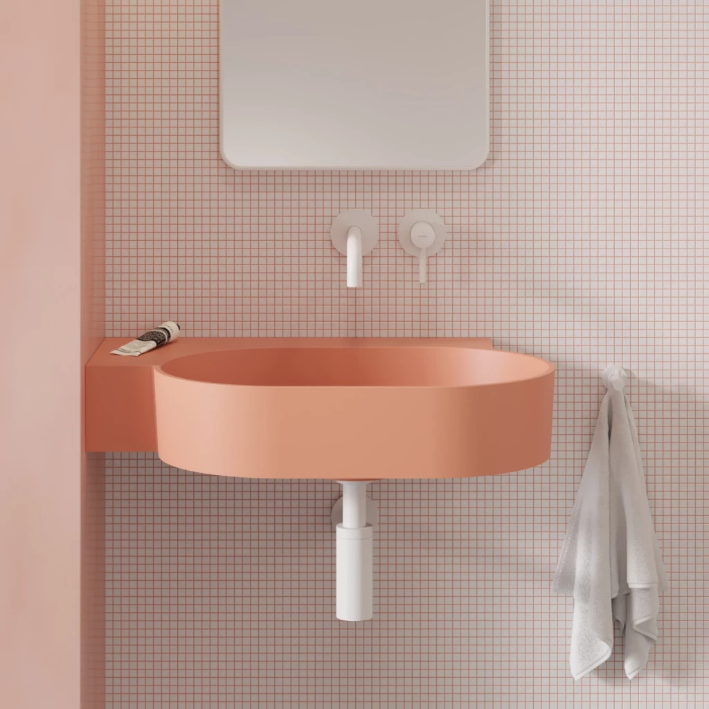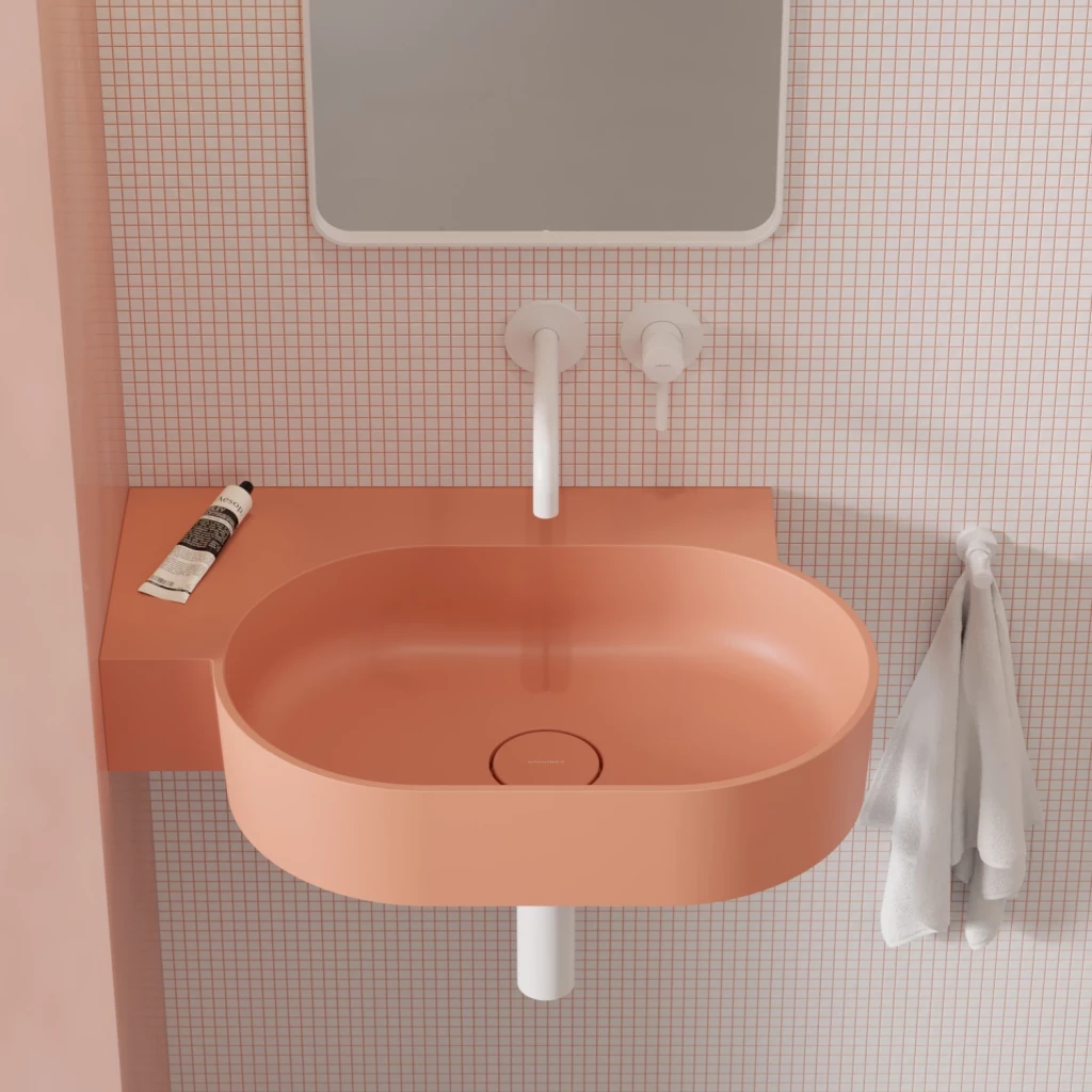 OVO v koralovej farbe (RAL3012) je umývadlo v decentnom odtieni ružovej so zamatovo hebkým matným povrchom. .