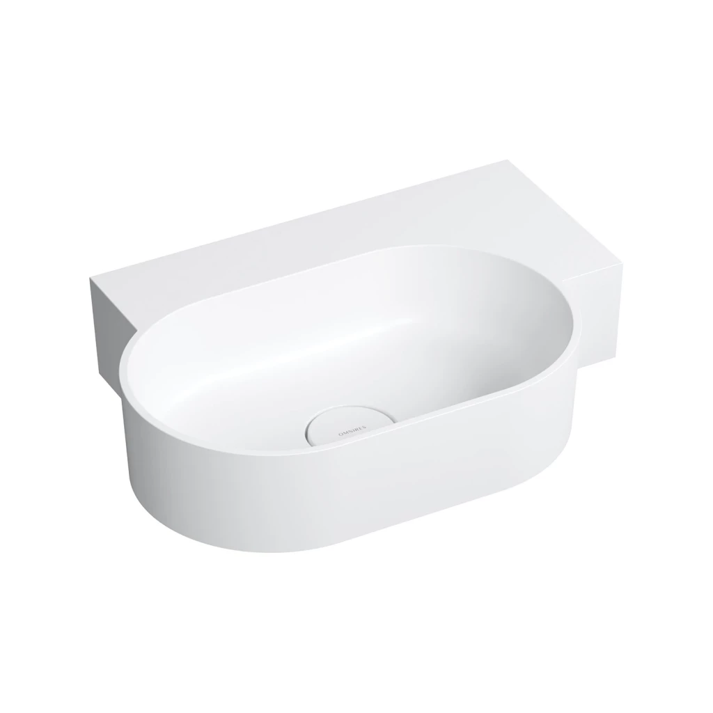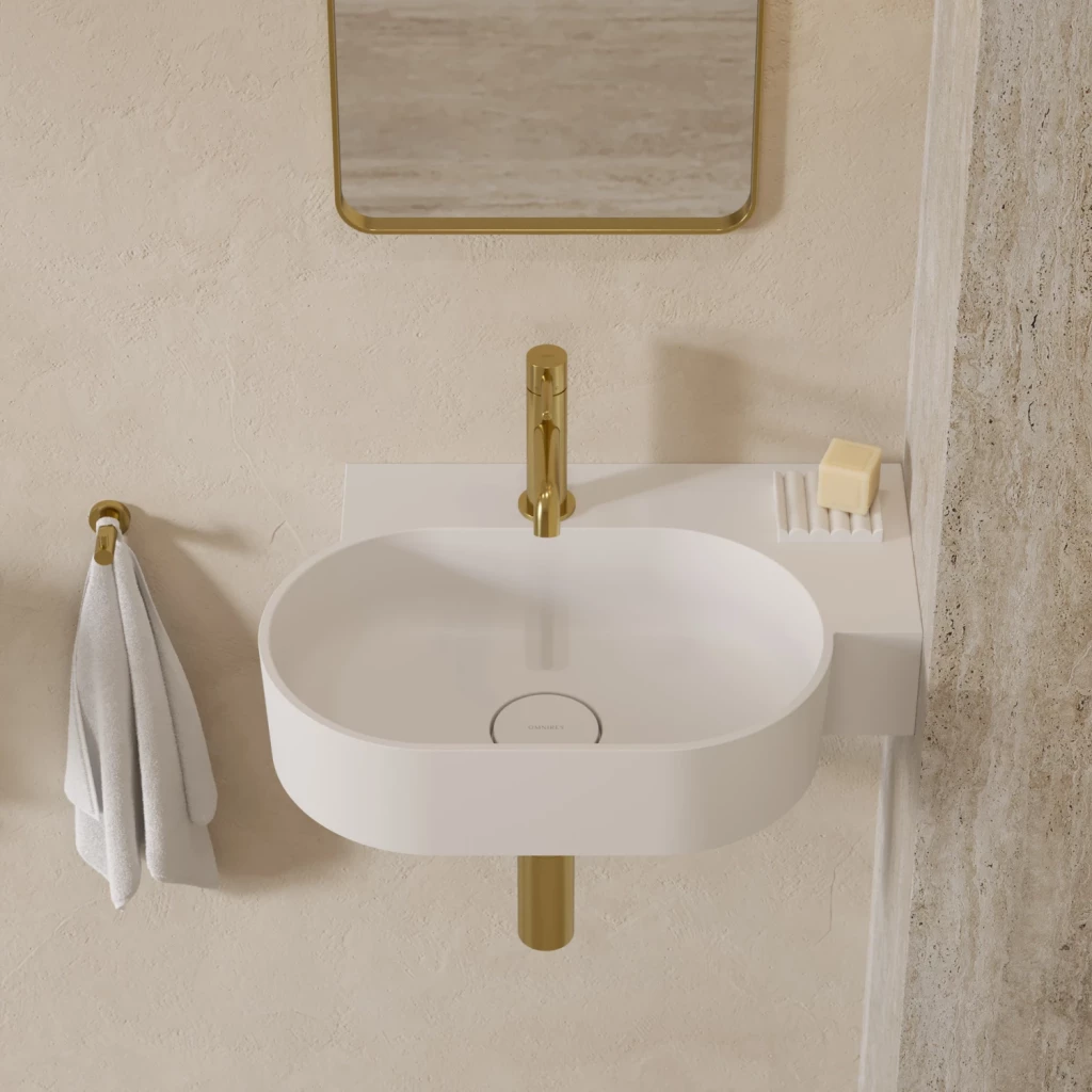 Umývadlo z kolekcie OMNIRES OVO sa vyznačuje minimalistickým, expresívnym tvarom s dokonalými proporciami. Hravá geometria vytvára oválnu misu v kombinácii s funkčnou obdĺžnikovou poličkou – ideálne miesto na montáž batérie, ale aj na uloženie kozmetiky a ďalších nevyhnutných doplnkov. Harmonicky profilované steny sú zakončené plochým okrajom, ktorý zdôrazňuje tvar, zatiaľ čo perfektne padnúci kryt odtoku zaručuje najvyššiu estetiku. Na spodnej strane umývadla je navrhnuté decentné, z výroby zatienené miesto, ktoré označuje umiestnenie otvoru pre batériu.