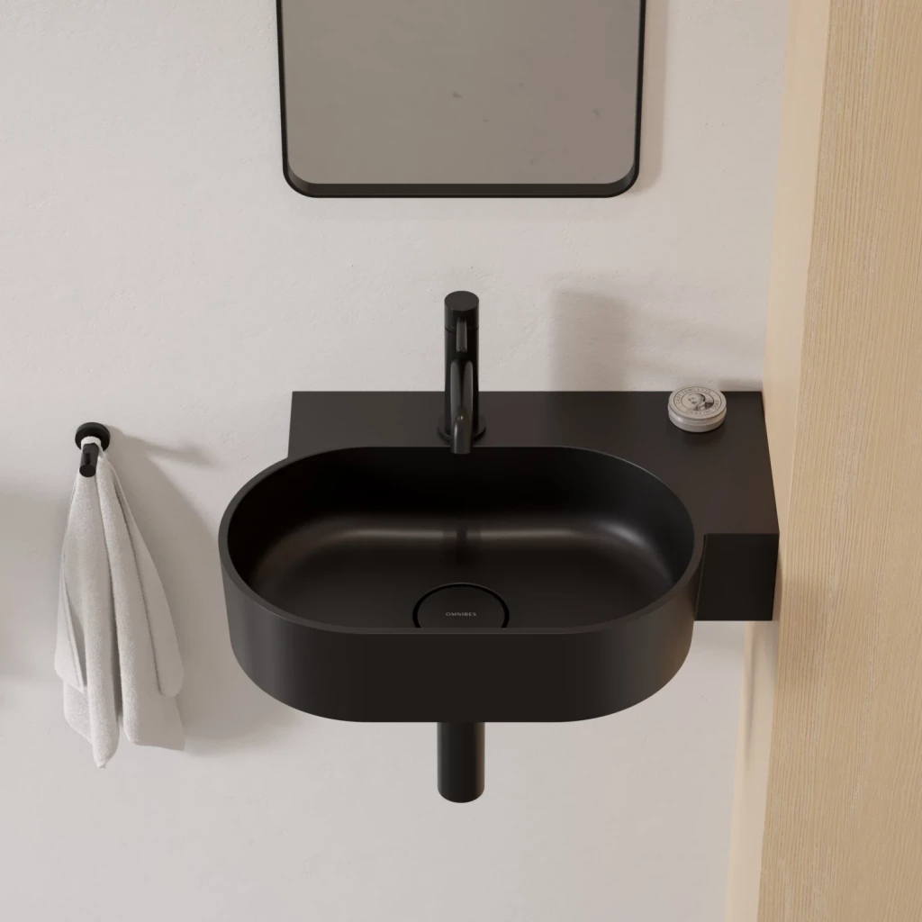 Umývadlo z kolekcie OMNIRES OVO sa vyznačuje minimalistickým, expresívnym tvarom s dokonalými proporciami. Hravá geometria vytvára oválnu misu v kombinácii s funkčnou obdĺžnikovou poličkou – ideálne miesto na montáž batérie, ale aj na uloženie kozmetiky a ďalších nevyhnutných doplnkov. Harmonicky profilované steny sú zakončené plochým okrajom, ktorý zdôrazňuje tvar, zatiaľ čo perfektne padnúci kryt odtoku zaručuje najvyššiu estetiku. Na spodnej strane umývadla je navrhnuté decentné, z výroby zatienené miesto, ktoré označuje umiestnenie otvoru pre batériu.