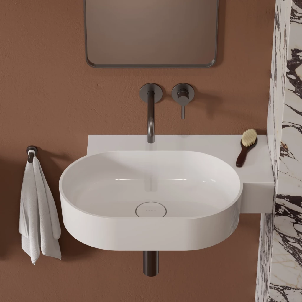 Umývadlo z kolekcie OMNIRES OVO sa vyznačuje minimalistickým, expresívnym tvarom s dokonalými proporciami. Hravá geometria vytvára oválnu misu v kombinácii s funkčnou obdĺžnikovou poličkou – ideálne miesto na montáž batérie, ale aj na uloženie kozmetiky a ďalších nevyhnutných doplnkov. Harmonicky profilované steny sú zakončené plochým okrajom, ktorý zdôrazňuje tvar, zatiaľ čo perfektne padnúci kryt odtoku zaručuje najvyššiu estetiku. Na spodnej strane umývadla je navrhnuté decentné, z výroby zatienené miesto, ktoré označuje umiestnenie otvoru pre batériu.