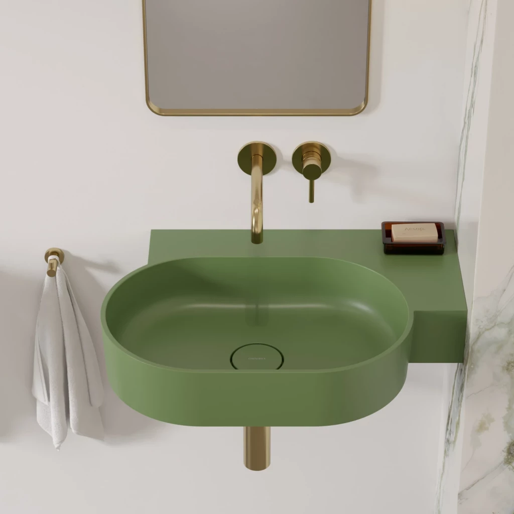 Umývadlo z kolekcie OMNIRES OVO sa vyznačuje minimalistickým, expresívnym tvarom s dokonalými proporciami. Hravá geometria vytvára oválnu misu v kombinácii s funkčnou obdĺžnikovou poličkou – ideálne miesto na montáž batérie, ale aj na uloženie kozmetiky a ďalších nevyhnutných doplnkov. Harmonicky profilované steny sú zakončené plochým okrajom, ktorý zdôrazňuje tvar, zatiaľ čo perfektne padnúci kryt odtoku zaručuje najvyššiu estetiku. Na spodnej strane umývadla je navrhnuté decentné, z výroby zatienené miesto, ktoré označuje umiestnenie otvoru pre batériu.