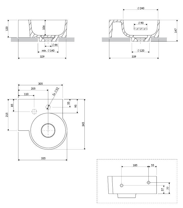 - V prípade inštalácie na pracovnú dosku je v pracovnej doske nutný kruhový výrez s priemerom 140 mm.