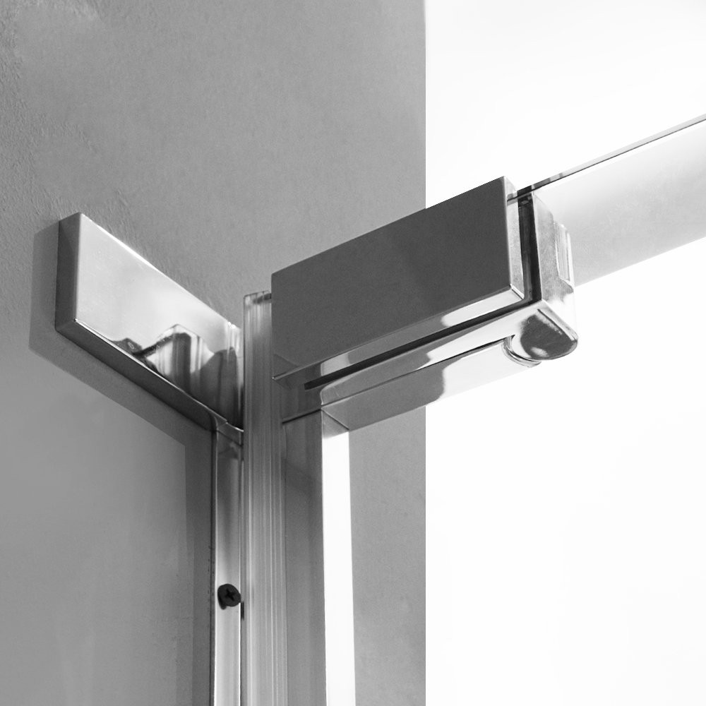 Čisté plochy kaleného skla v kombinácii s chrómovými časťami pántov a doplnkov.