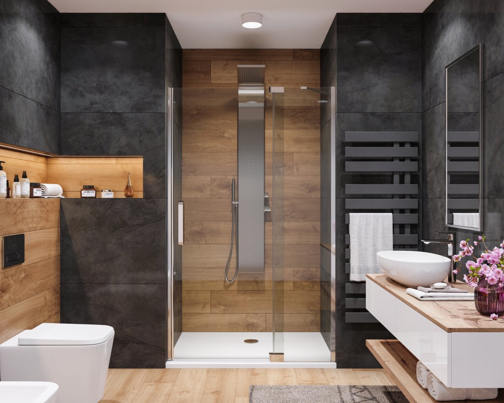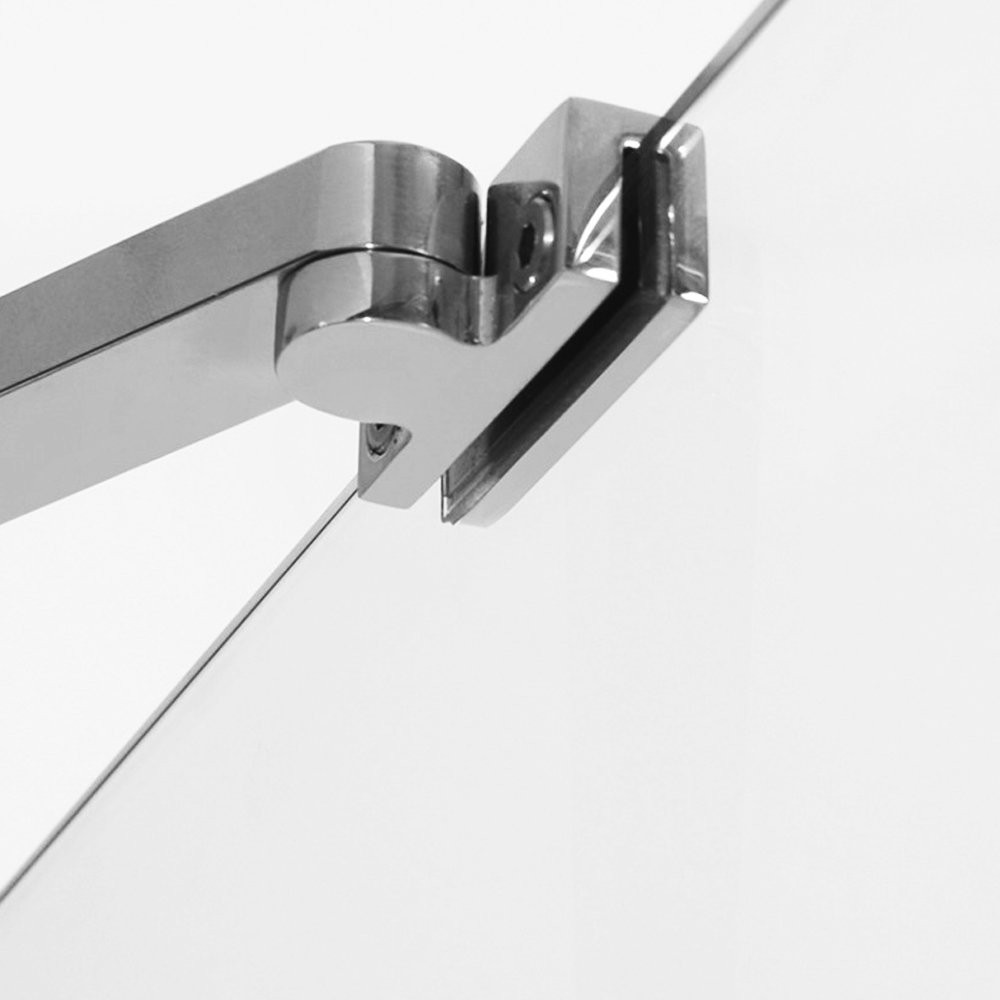 Čisté plochy kaleného skla v kombinácii s chrómovými časťami pántov a doplnkov.