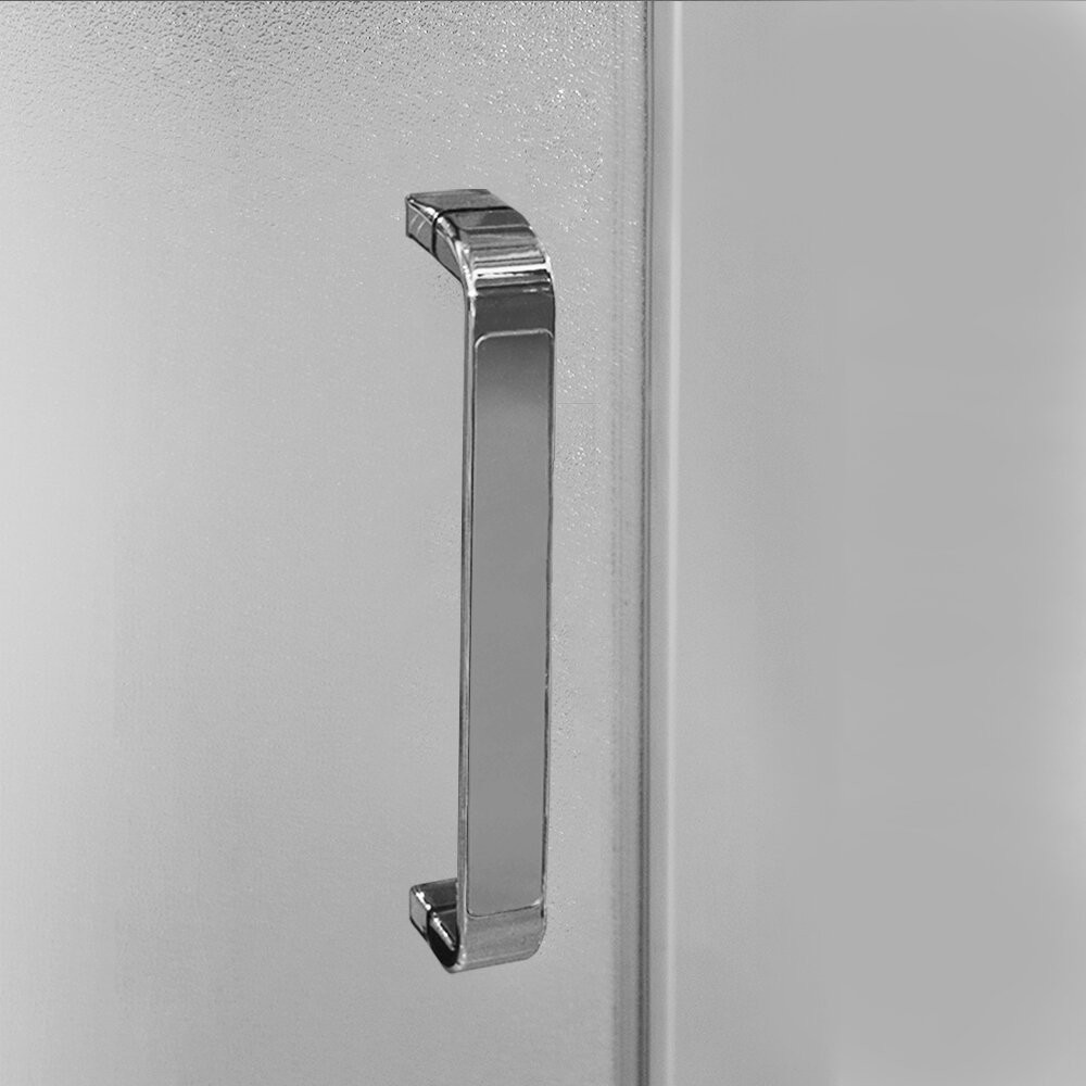 Čisté plochy kaleného skla v kombinácii s chrómovými časťami pántov a doplnkov.
