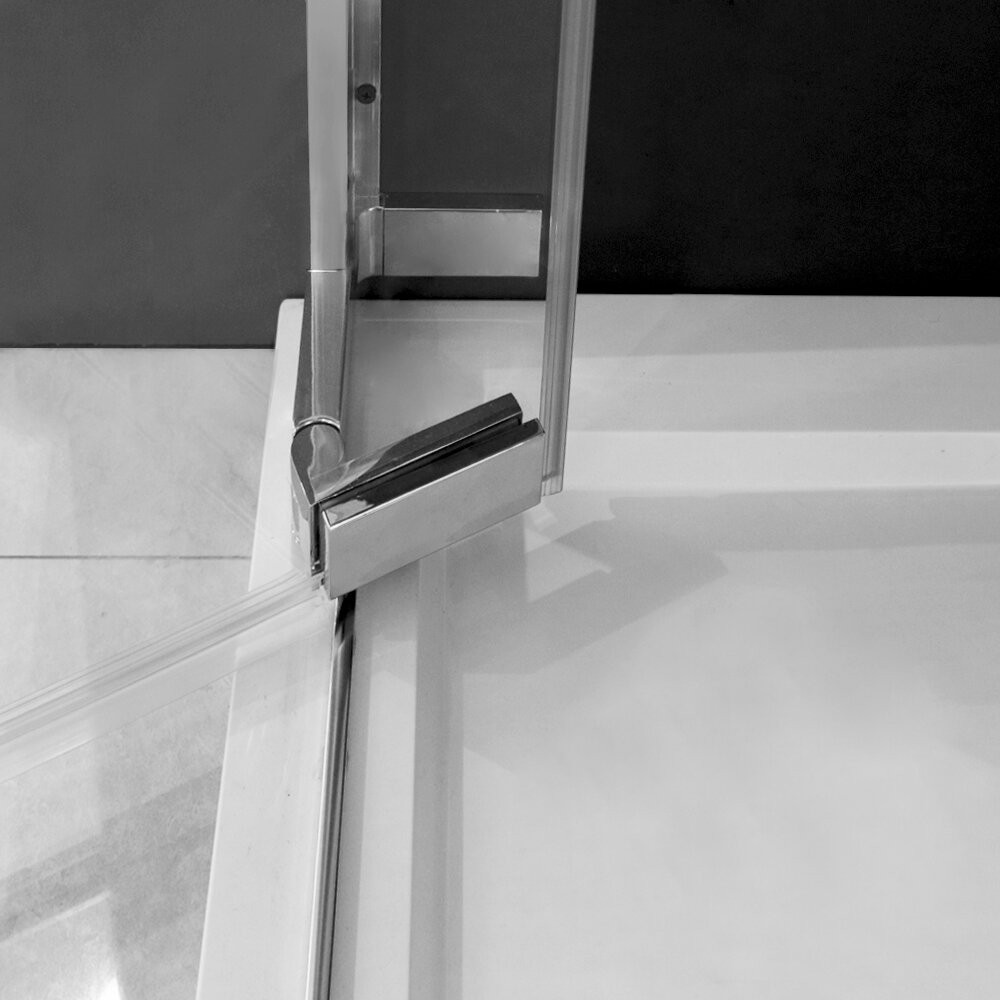 Čisté plochy kaleného skla v kombinácii s chrómovými časťami pántov a doplnkov.