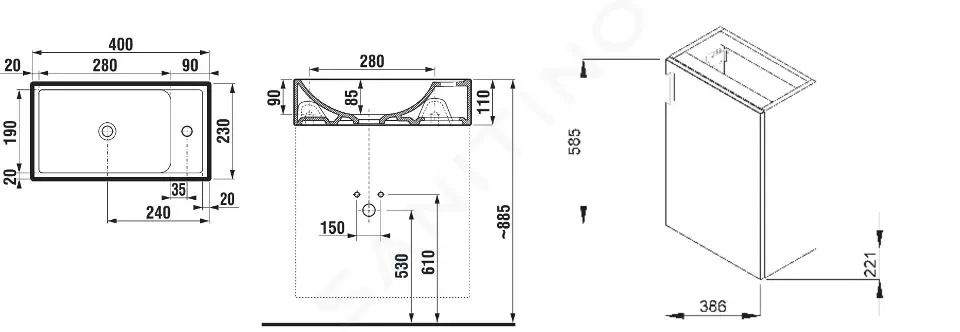 - umývadielko 400 x 230 mm, s 1 otvorom pre batériu vpravo