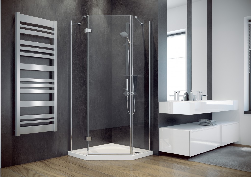 Päťuholníkový celosklenený sprchovací kút VIVA 195P vyniká vysoko kvalitným spracovaním a spoľahlivou funkčnosťou všetkých súčastí a materiálov. Zástena sa skladá z dvoch pevných skiel a dverí, ktoré sú osadené elegantným madlom a minimalistické pánty, ktoré sú dokonale zladené a poskytujú zástene jedinečný vzhľad. Spodná hrana dverného skla je opatrená odkvapničkou , vďaka ktorej voda zo skla pri otvorení nestečie do priestoru kúpeľne , ale do vnútorného priestoru kúta.
