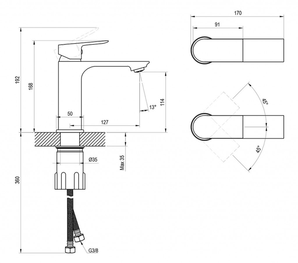 - pripojenie G 3/8", flexibilné hadičky 450 mm