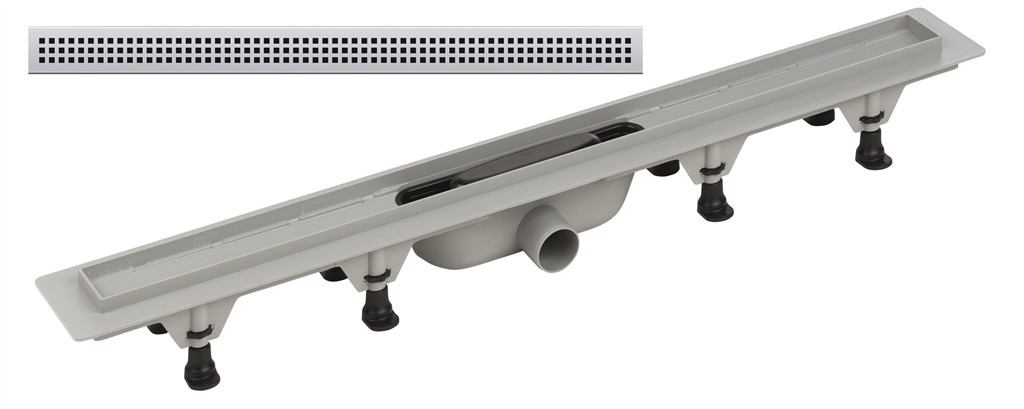 Obsah balenia: žľab s roštom, sifón, butylénový pás pre napojenie hydroizolácie, nastaviteľné nohy, kľúč pre vyberanie roštu.