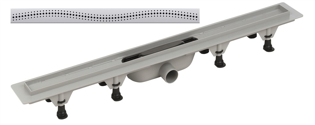 Obsah balenia: žľab s roštom, sifón, butylénový pás pre napojenie hydroizolácie, nastaviteľné nohy, kľúč pre vyberanie roštu.