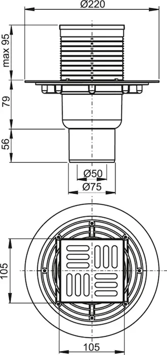 Podlahová vpusť 105 × 105/50/75 priama, mriežka nerez, kombinovaná zápachová uzávera SMART