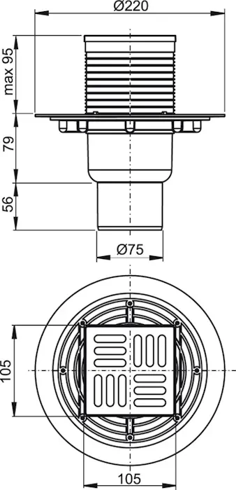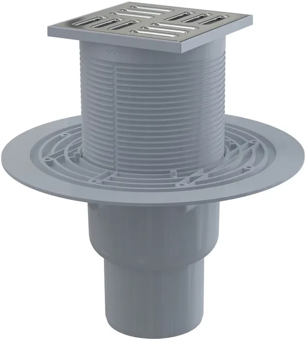 Podlahová vpusť 105 × 105/50/75 priama, mriežka nerez, vodná zápachová uzávera