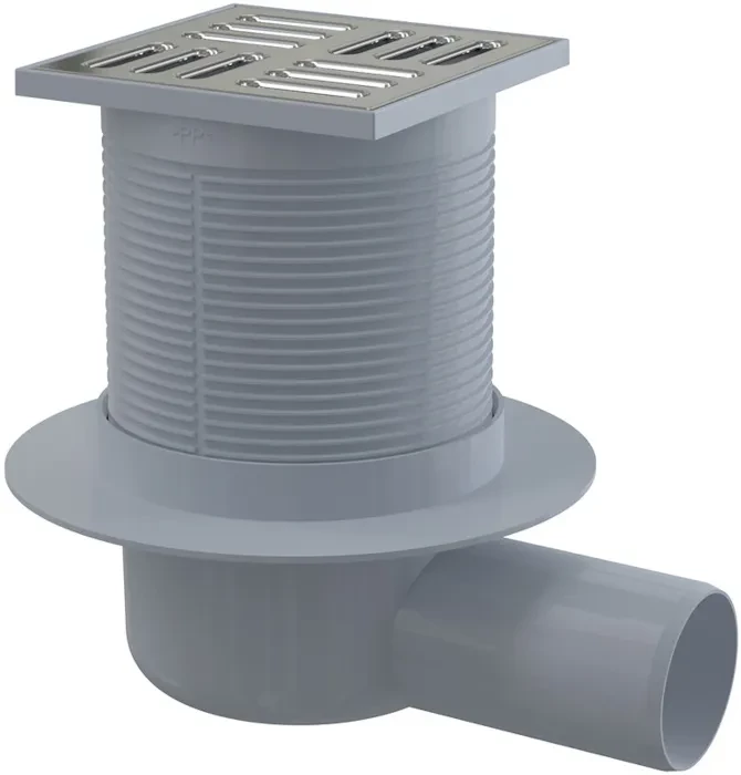Podlahová vpusť 105 × 105/50 bočná, mriežka nerez, vodná zápachová uzávera