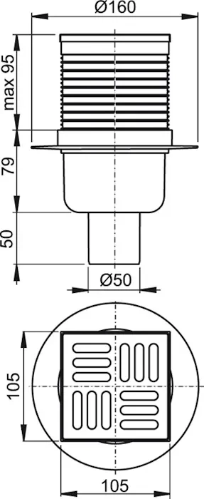 Podlahová vpusť 105 × 105/50 priama, mriežka nerez, vodná zápachová uzávera