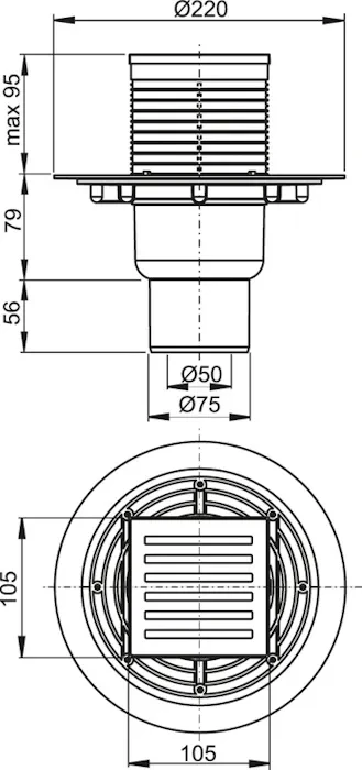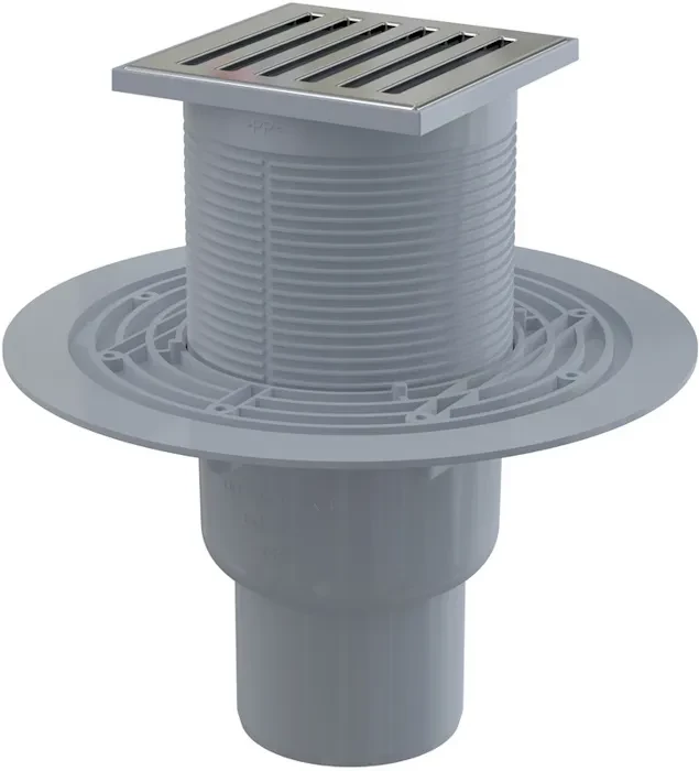 Podlahová vpusť 105 × 105/50/75 priama, mriežka nerez, vodná zápachová uzávera