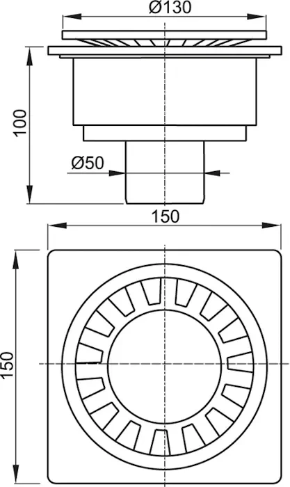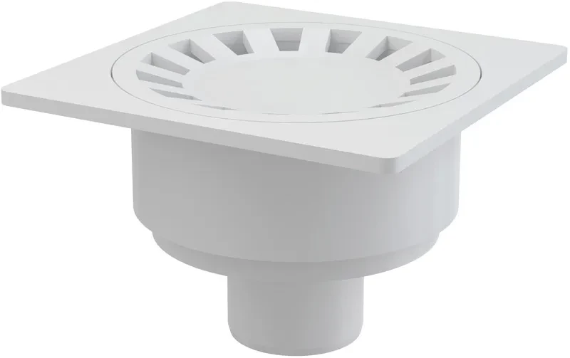 Podlahová vpusť 150 × 150/50 priama, mriežka biela, vodná zápachová uzávera
