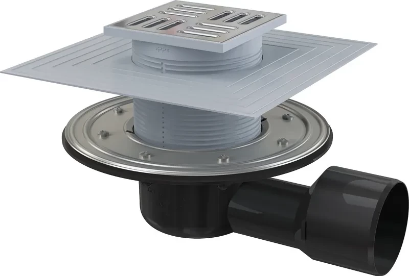 Podlahová vpusť 105 × 105/50/75 bočná, mriežka nerez, nerezová príruba a límec 2. úrovne izolácie, vodné a suchá zápachová uzávera