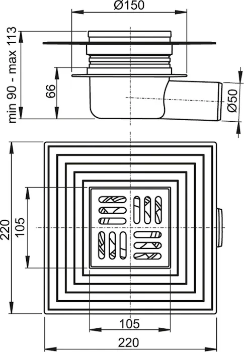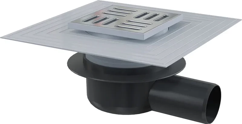 Podlahová vpusť 105 × 105/50 bočná, mriežka nerez, límec 2. úrovne izolácie, suchá zápachová uzávera