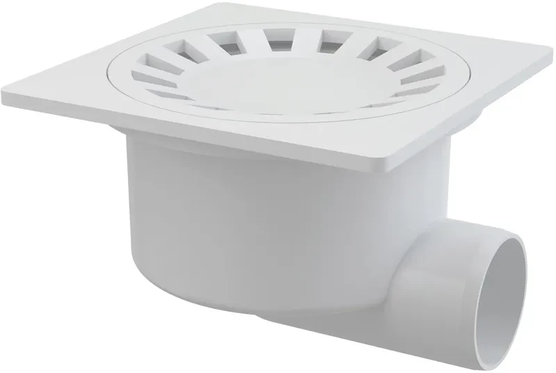 Podlahová vpusť 150 × 150/50 bočná, mriežka biela, vodná zápachová uzávera