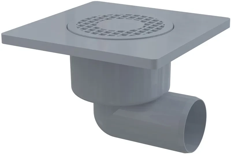 Podlahová vpusť 150 × 150/50 bočná, mriežka šedá, vodná zápachová uzávera
