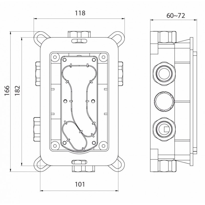 - Podomietkový montážny box , ktorý je určený pre podomietkovú sprchovú batériu s prepínačom KUBO-2F-UNO.