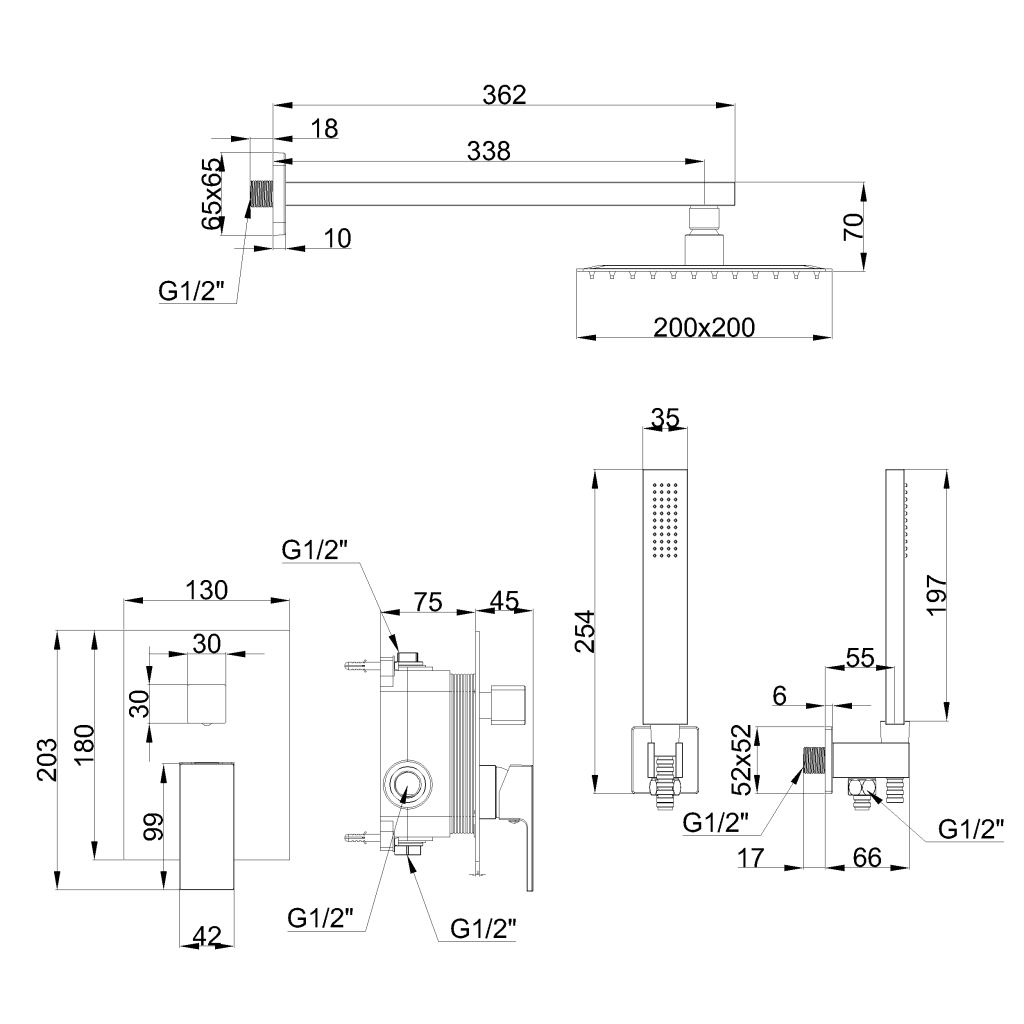 - Štíhlu, štvorcovú dažďovú sprchu (20 × 20 cm) z nerezovej ocele s systémom proti usadzovaniu vodného kameňa – pre ľahkú údržbu a dlhú životnosť.
