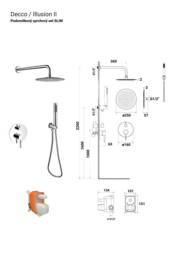 Súčasťou balenia je podomietková batéria SLIM Decca / ILLUSION II + podomietkový montážny box + ručná sprcha + sprchová hadica + vývod a držiak ručnej sprchy + hlavová sprcha s držiakom.