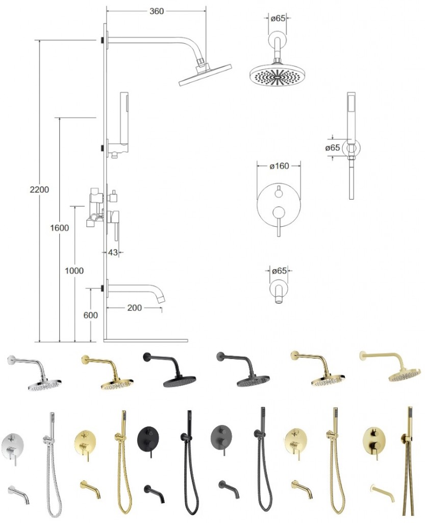 - Set obsahuje podomietkovú batériu, vývod zo steny s držiakom, vrátane ručnej sprchy a hadice, ďalej držiak a okrúhlu hlavovú sprchu a stenový vývod