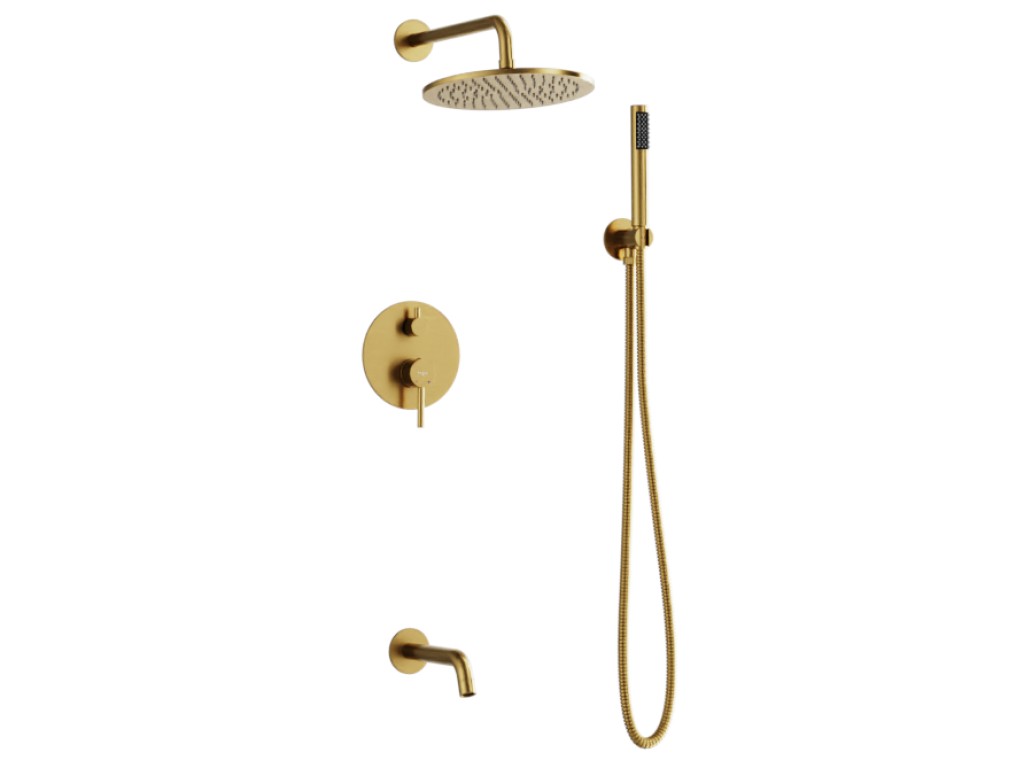 Súčasťou balenia je podomietková batéria VEO zlatá brúsená je podomietkový montážny box + ručná sprcha + sprchová hadica + vývod a držiak ručnej sprchy + držiak a hlavová sprcha + stenový vývod.
