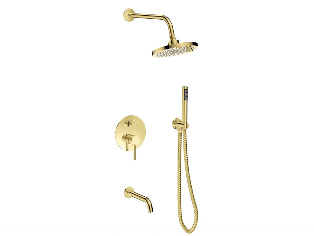 Jedinečný podomietkový set s príslušenstvom VEO zlatá lesklá farba . Kompletné riešenie pre vašu vaňu. Set obsahuje podomietkovú batériu (box), vývod zo steny s držiakom, vrátane ručnej sprchy a hadice, ďalej držiak a okrúhlu hlavovú sprchu av neposlednom rade praktický stenový vývod . Batéria je dodávaná vrátane podomietkového modulu (boxu) , ten výrazne uľahčuje vlastnú montáž. Dodávame v šiestich farbách a to lesklý chróm, čierna, grafitová, zlatá, zlatá lesklá, zlatá brúsená.