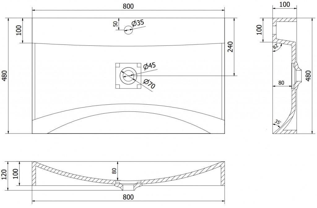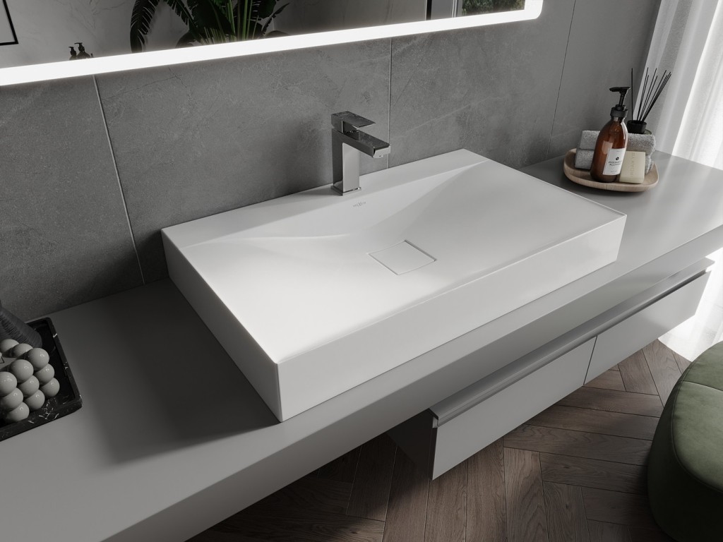 Samotné umývadlo na dosku je dlhé 80 cm, hlboké 48 cm a vysoké 10 cm . Umývadlo nemá bezpečnostný prepad, len otvor pre batériu. Preto je vhodné kombinovať s nízkou umývadlovou batériou.