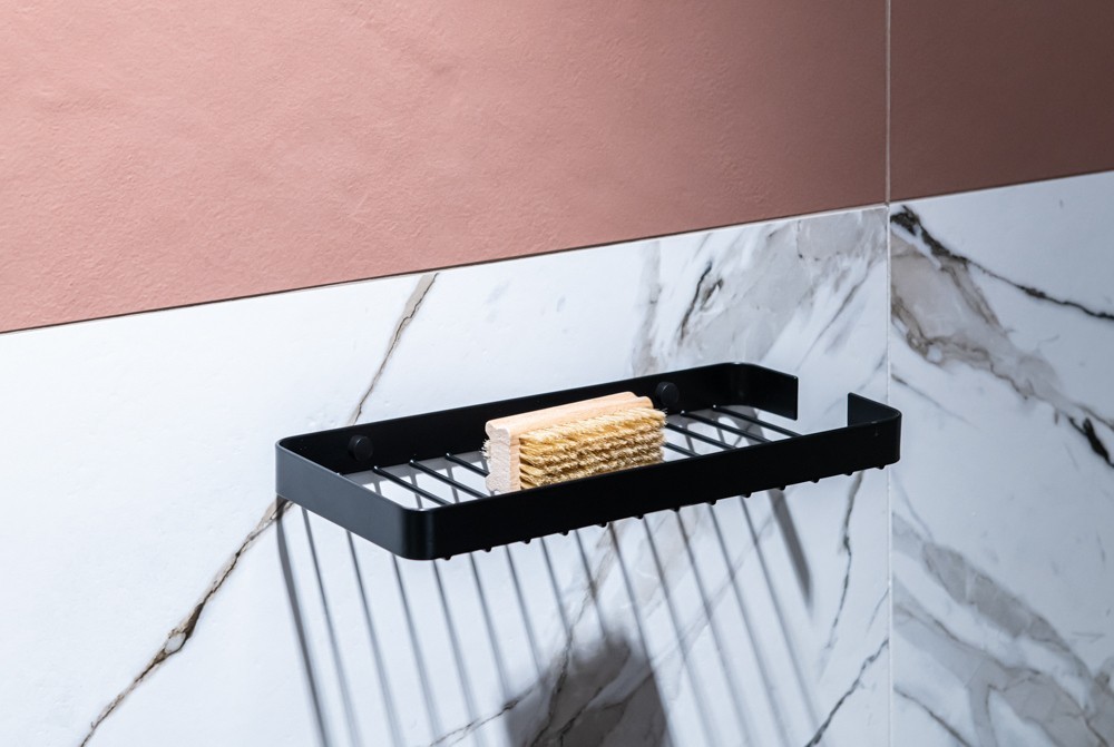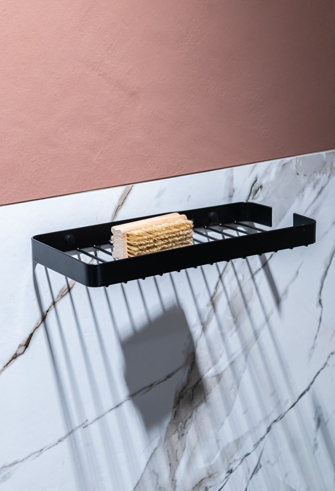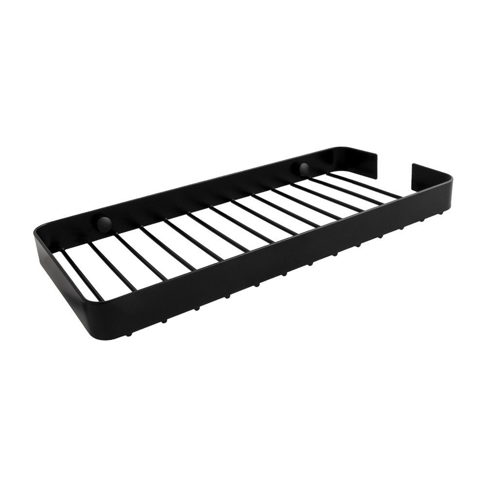 Obdĺžniková kúpeľňová polička z masívneho drôtu v čiernej farbe s matným povrchom. Kúpeľňová polička má na boku špeciálny výrez, vďaka ktorému môžeme zavesiť napr. špongiu na umývanie.