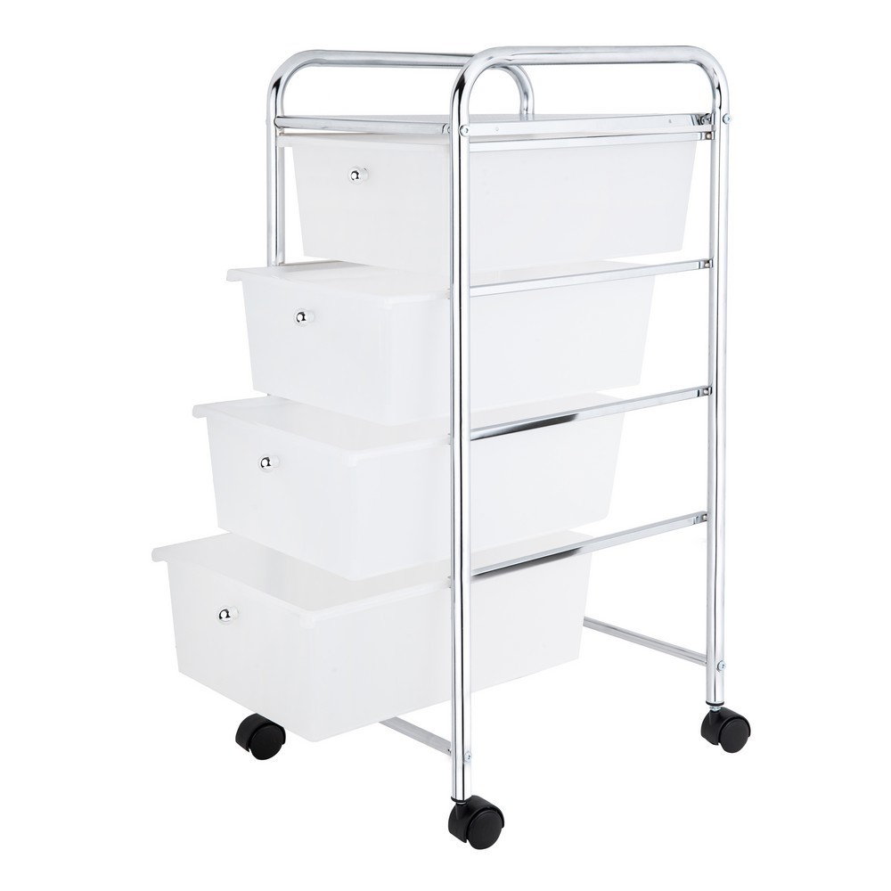 Kúpeľňová polička na kolieskach so 4 praktickými úložnými zásuvkami. Biele zásuvky sú vyrobené z plastu. Na výrobu rámu bola použitá chrómovaná oceľ. Polička na kolieskach sa bude dobre hodiť takmer do každej kúpeľne, toaletného stolíka, šatne, kozmetického salónu alebo kaderníctva.