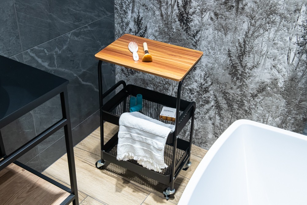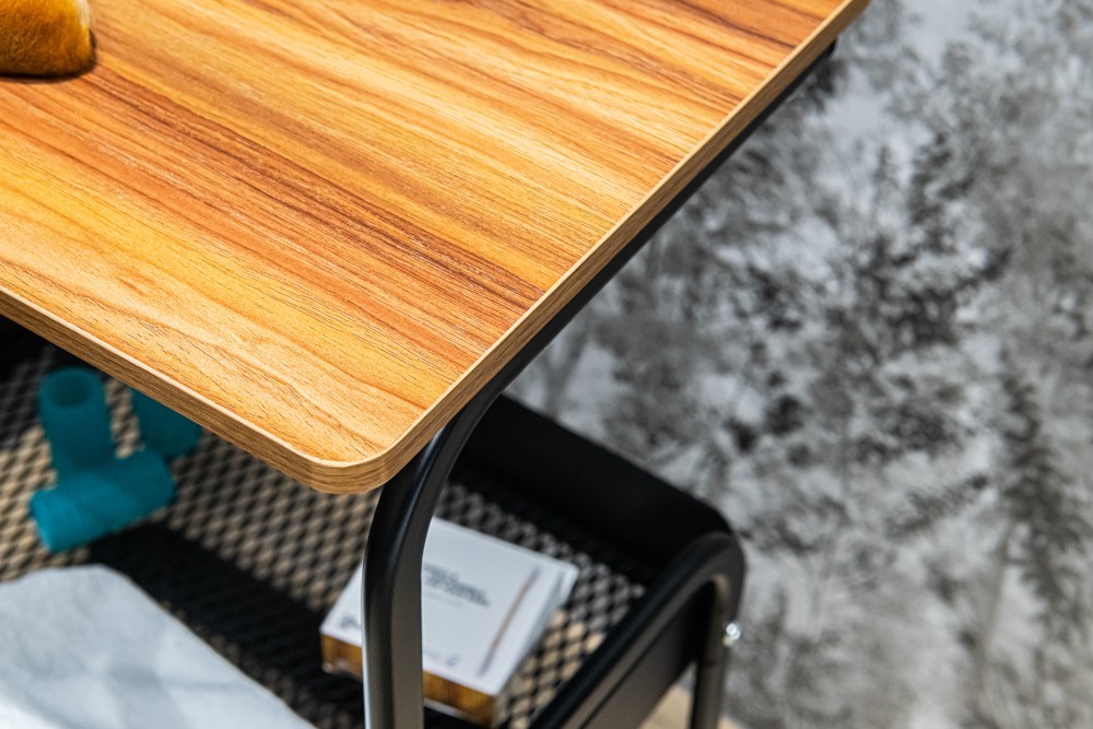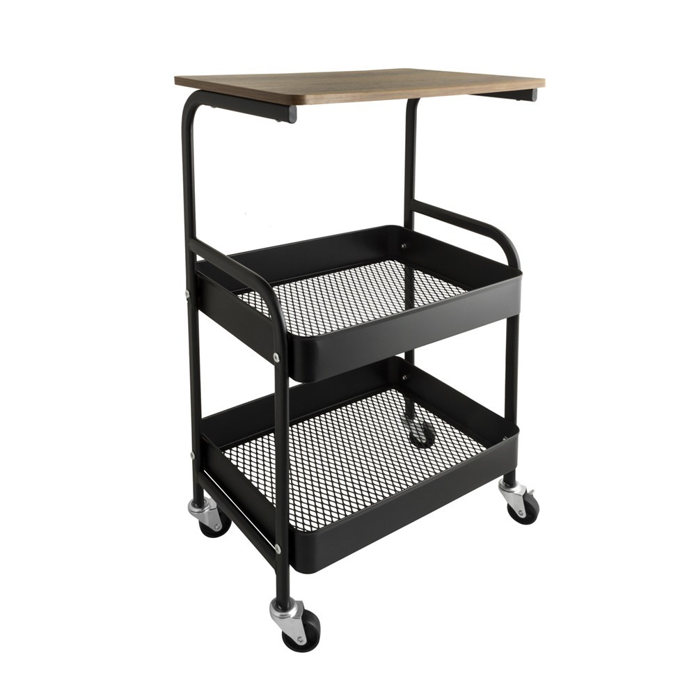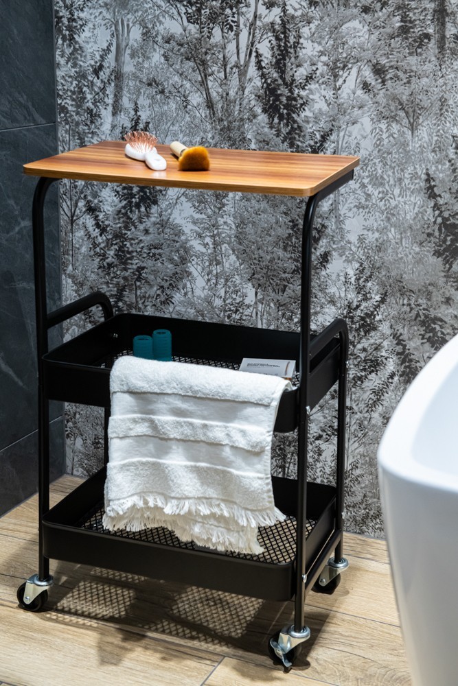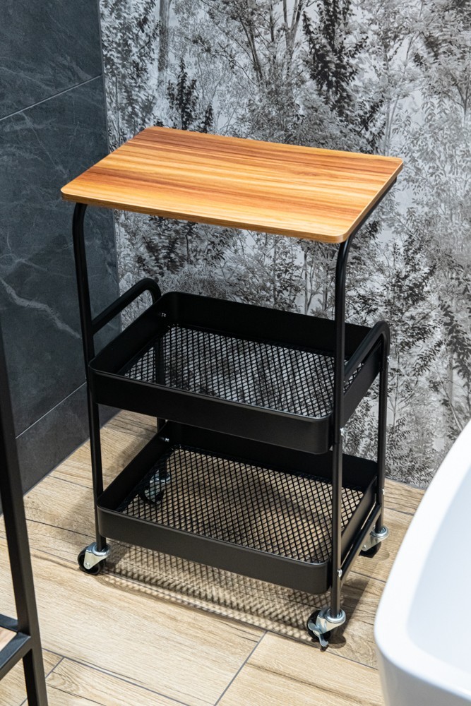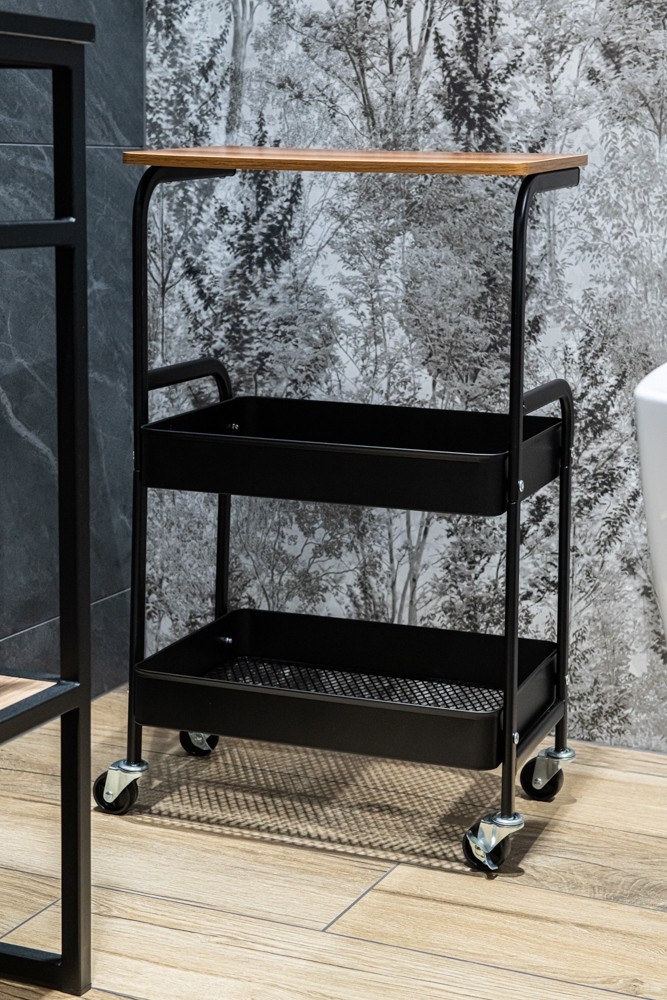 Police na kolieskach z čierno lakovanej ocele. Má funkčný vršok imitujúci prírodné drevo. Navyše má dva koše s prelamovaným dnom. Kolieska zaisťujú mobilitu, ale sú tiež vybavené zámkami. Police vyžaduje montáž svojpomocne.
