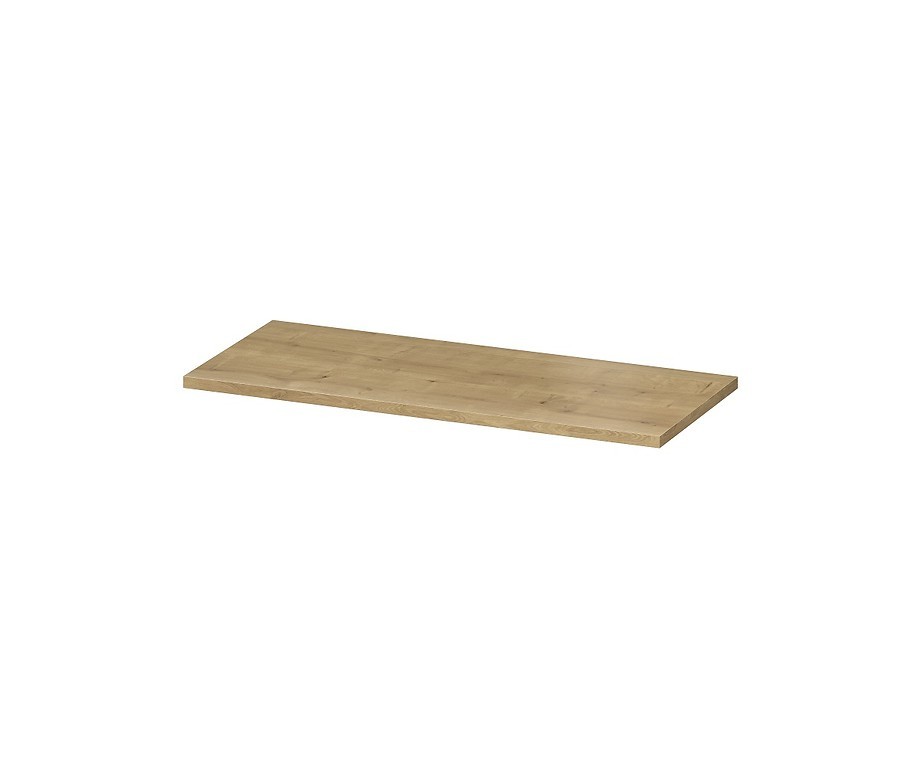 Doska pre konfiguráciu s podpultovým nábytkom , na ktorú môžeme namontovať umývadlo alebo umiestniť šikovné drobnosti a kozmetiku. Vrchná doska je vyrobená z laminované drevotrieskové dosky vo farbe dub .