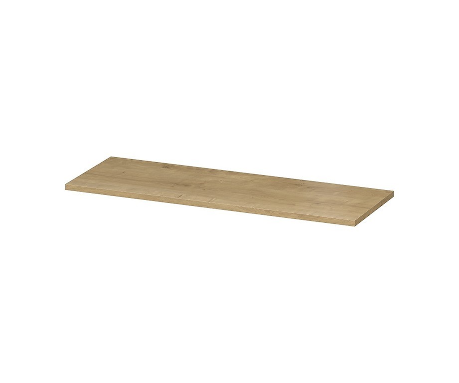 Doska pre konfiguráciu s podpultovým nábytkom , na ktorú môžeme namontovať umývadlo alebo umiestniť šikovné drobnosti a kozmetiku. Vrchná doska je vyrobená z laminované drevotrieskové dosky vo farbe dub .