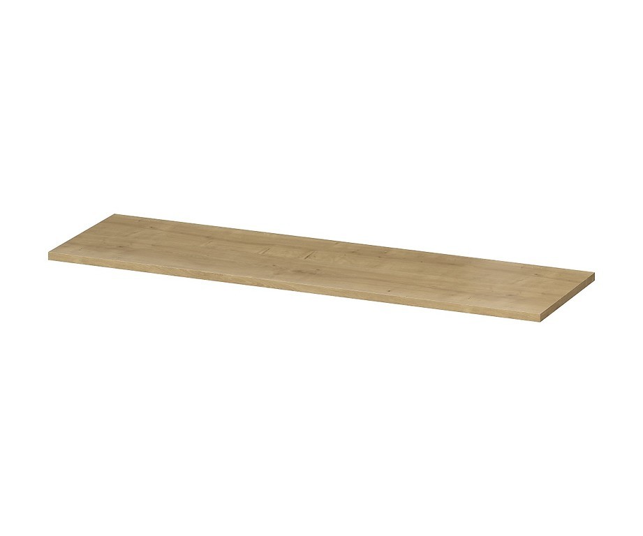 Doska pre konfiguráciu s podpultovým nábytkom , na ktorú môžeme namontovať umývadlo alebo umiestniť šikovné drobnosti a kozmetiku. Vrchná doska je vyrobená z laminované drevotrieskové dosky vo farbe dub .