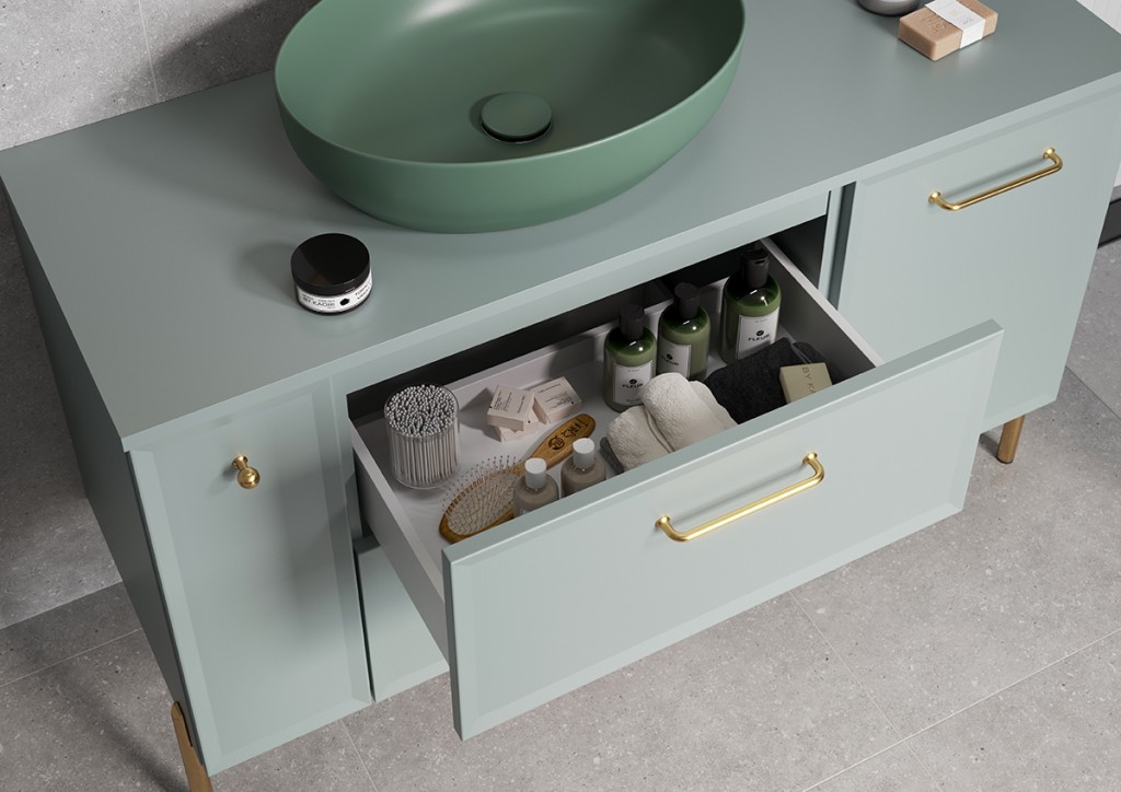 Kolekcia Mille je štýlová, funkčná a predovšetkým praktická , pretože okrem jednoduchého systému spájania prvkov ponúka nábytok a dokončovacie doplnky v mnohých farebných variantoch. Čelá nábytku sú vyrobené z MDF dosky a sú frézované, táto jednoduchá forma bez zbytočných zákutí umožňuje ľahké čistenie. Nábytok Mille je k dispozícii v troch farbách na výber: matná biela, matná čierna a fjord /matná zelená/. Rafinované detaily, ako sú úchyty a nohy v striebornej, čiernej a zlatej farbe. Pracovné dosky sú k dispozícii v troch farbách : matná biela, matná čierna, fjord /matná zelená/ av štyroch veľkostiach : 60, 80, 100, 120 cm. Okrem radu skriniek prispôsobených k nábytkovým umývadlám , tak umývadlám na dosku ponúka kolekcia rôzne typy prídavných skriniek pod dosku . V ponuke sú navyše nábytkové stĺpiky , ktoré dokonale uľahčia organizáciu priestoru v každej kúpeľni. Všetky skrine sú vybavené systémom mäkkého zatvárania.