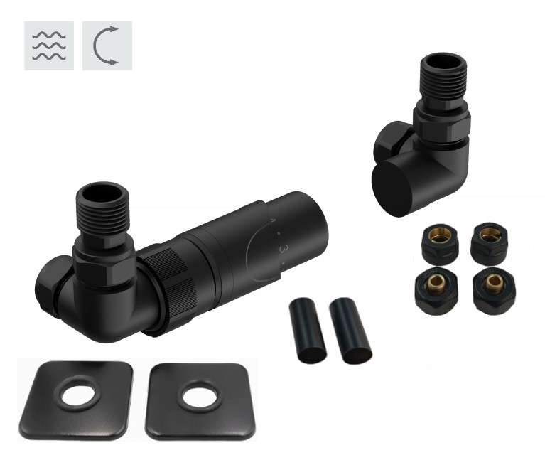 Rohová obojstranná (ľavá aj pravá) termostatická sada PRIME vr. krycích roziet a 2 krycích trubičiek (mosadz) je určená pre pripojenie radiátorov na rozvody TÚV s vývodom zo steny s rôznym rozstupom ( krajné - rohové pripojenie ).