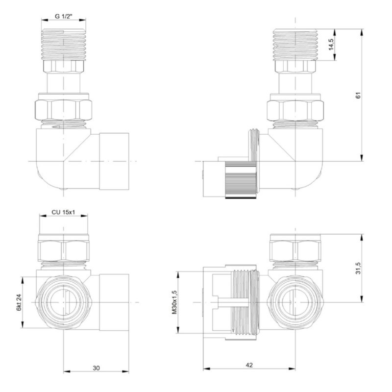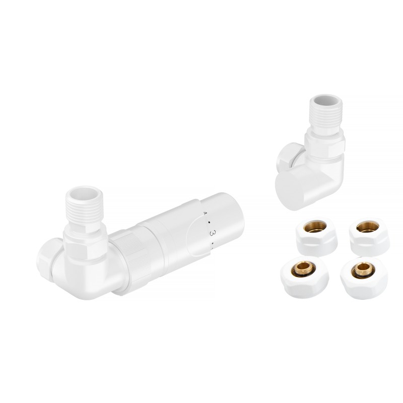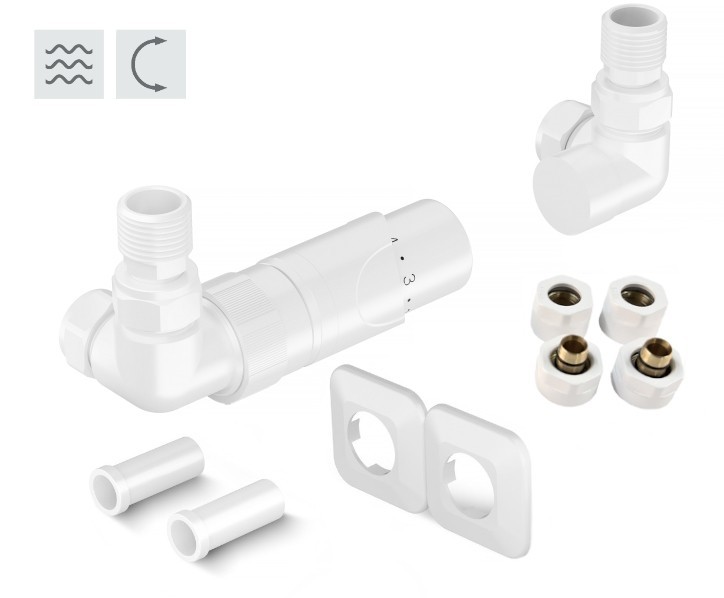 Rohová obojstranná (ľavá aj pravá) termostatická sada PRIME vr. krycích roziet a 2 krycích trubičiek (plast) je určená pre pripojenie radiátorov na rozvody TÚV s vývodom zo steny s rôznym rozstupom ( krajné - rohové pripojenie ).